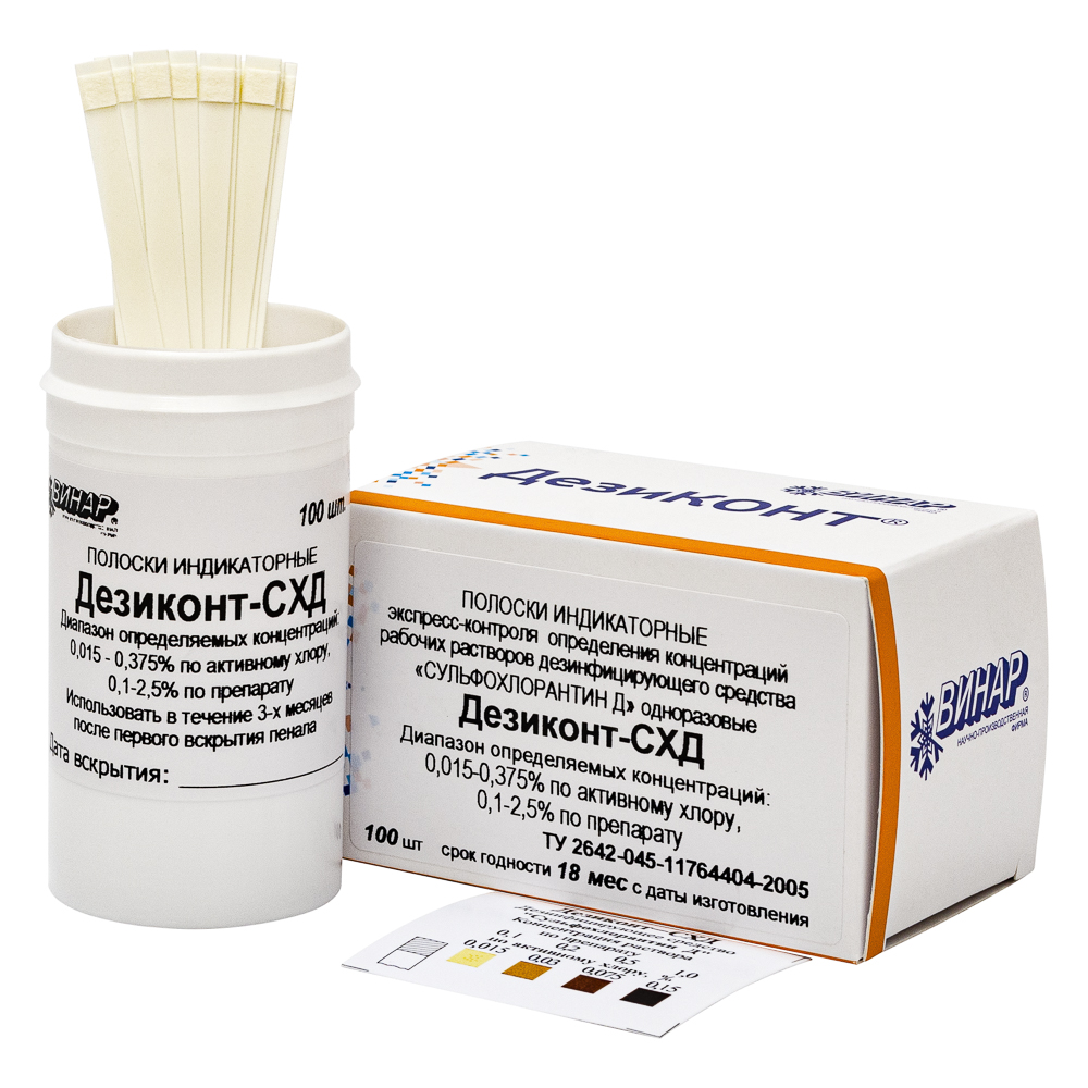 Полоски индикаторные экспресс-контроля концентраций рабочих растворов дезинфицирующего средства «СУЛЬФОХЛОРАНТИН Д», одноразовые «Дезиконт-СХД», 100 – купить оптом