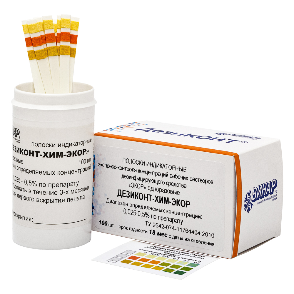 Полоски индикаторные экспресс-контроля концентраций рабочих растворов дезинфицирующего средства «Экор», одноразовые «Дезиконт-хим-Экор», 100 – купить оптом