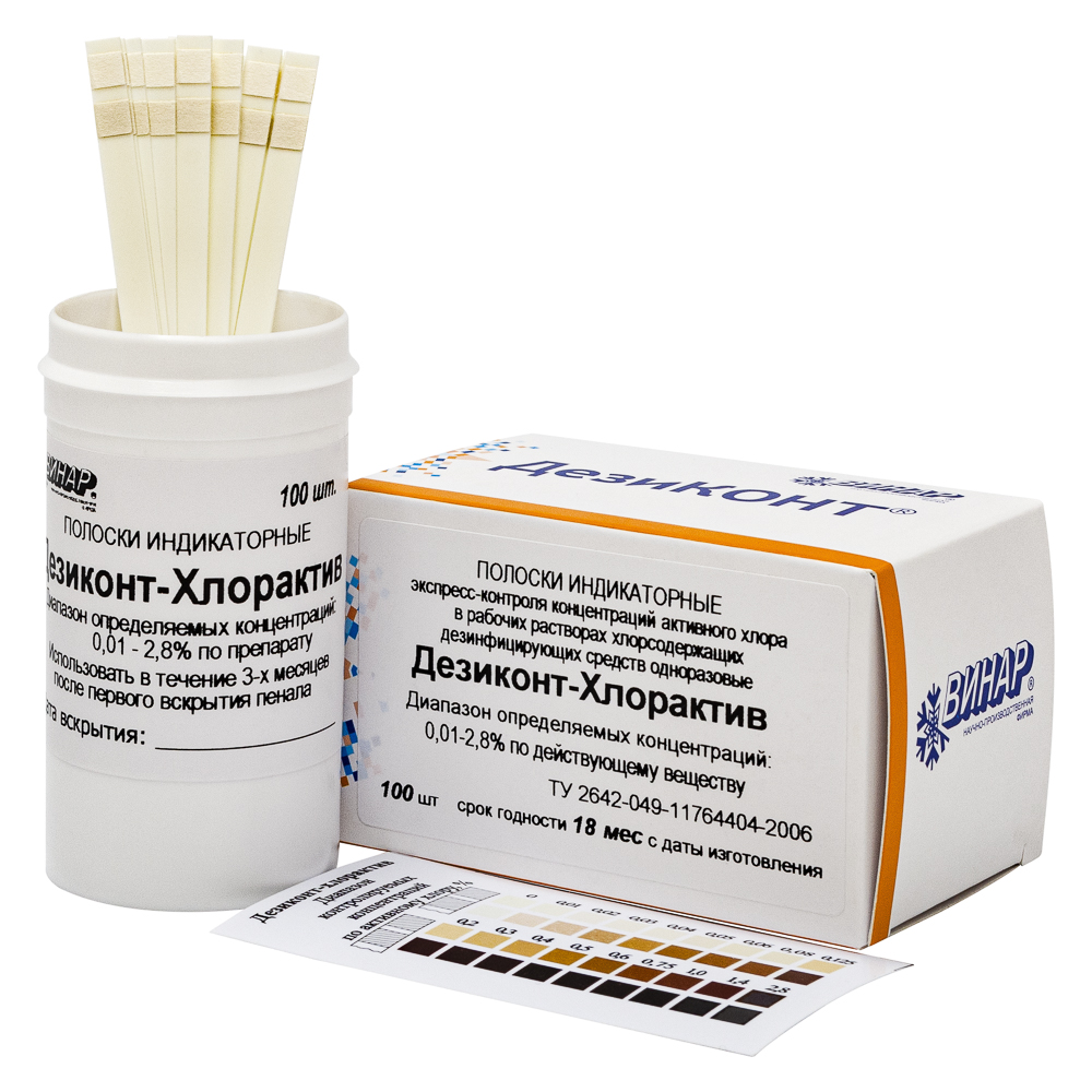 Полоски индикаторные экспресс-контроля концентраций рабочих растворов хлорсодержащих дезинфицирующих средств, одноразовые «Дезиконт-ХЛОРАКТИВ», 100