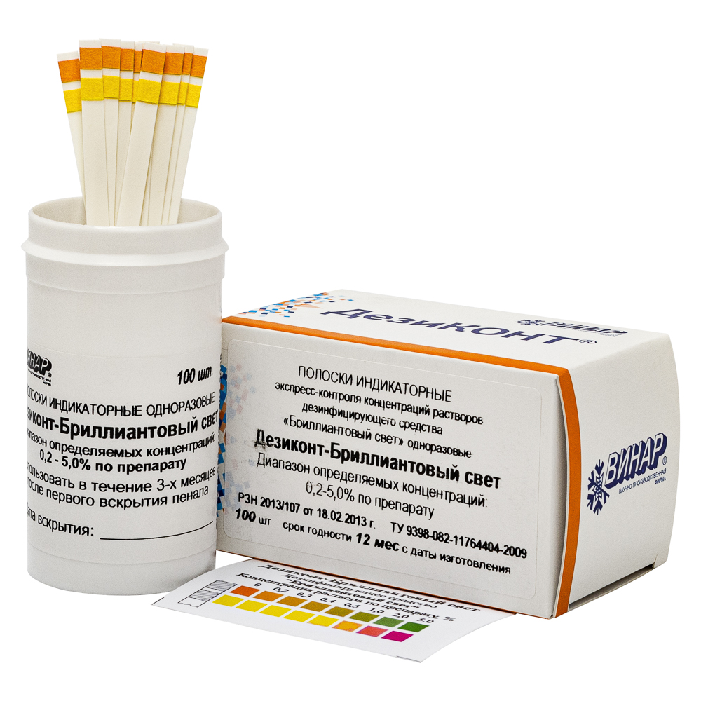 Полоски индикаторные экспресс-контроля концентраций растворов дезинфицирующего средства «Бриллиантовый свет», одноразовые «Дезиконт-Бриллиантовый свет», 100 – купить оптом